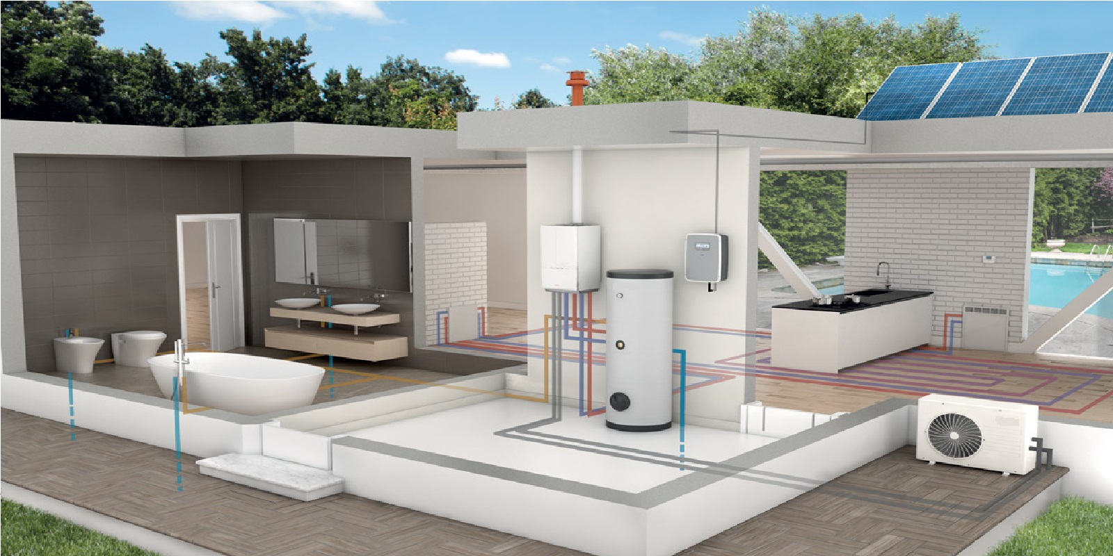 L’acqua calda prodotta con un impianto solare termico può inoltre essere utilizzata per integrare il riscaldamento, con un notevole risparmio sui consumi. Particolarmente redditizio è il collegamento con impianti a pannelli radianti a pavimento, a soffitto o a parete.